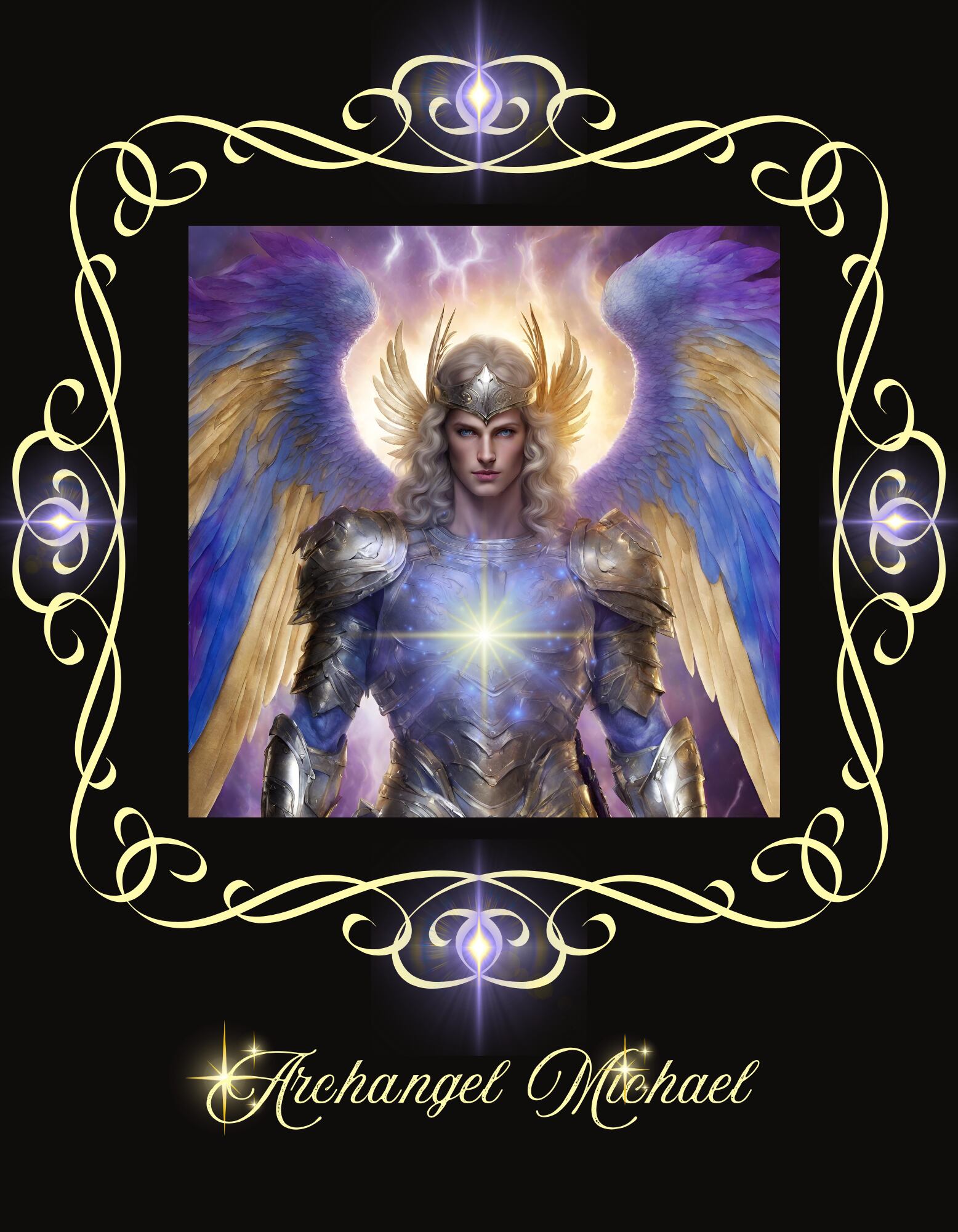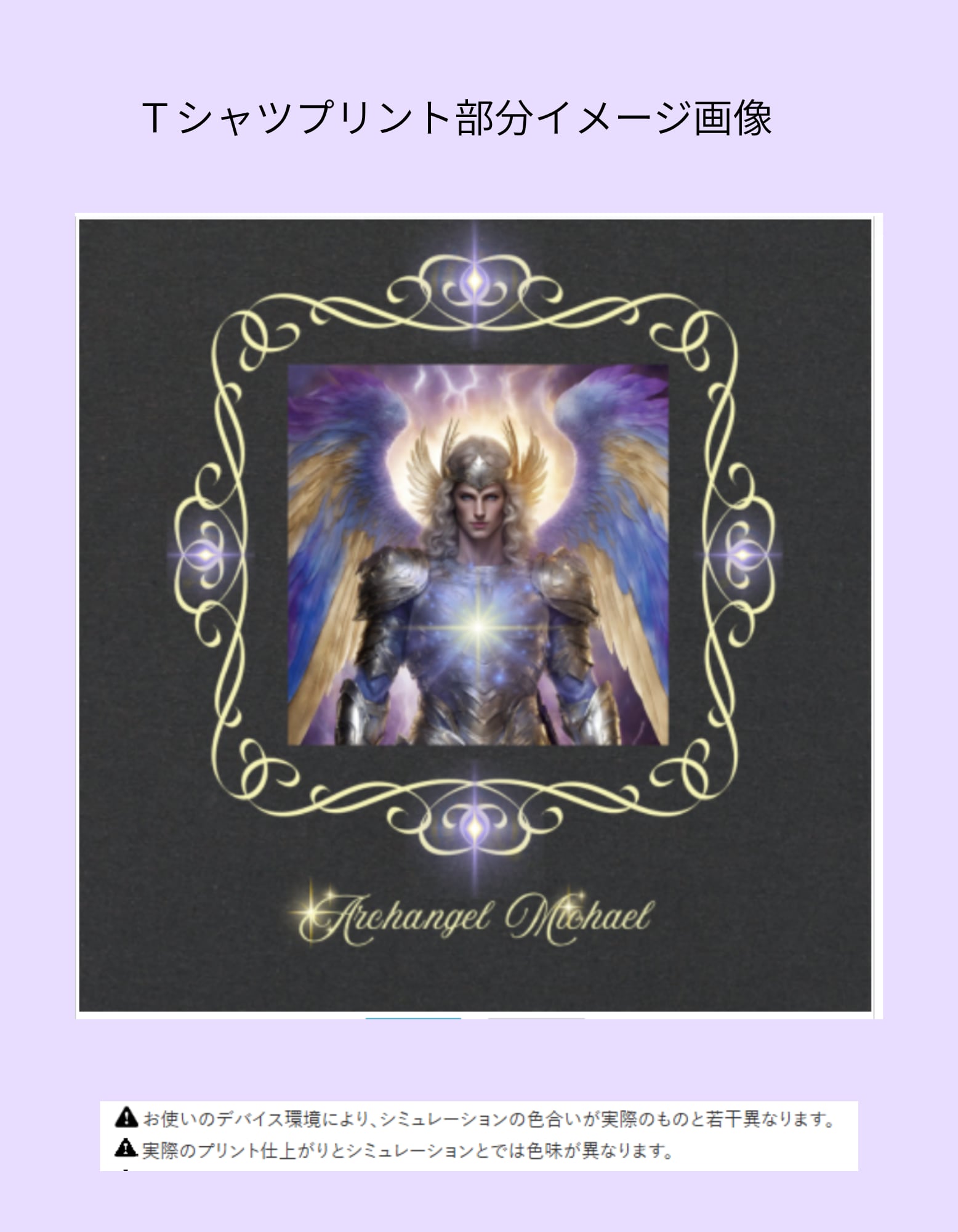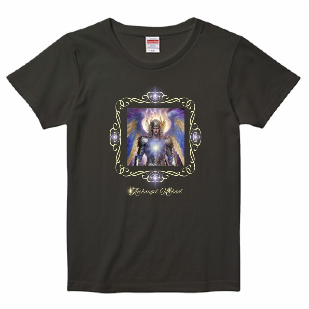 神秘的で力強い大天使ミカエルのデザインがプリントされたレディースTシャツです。