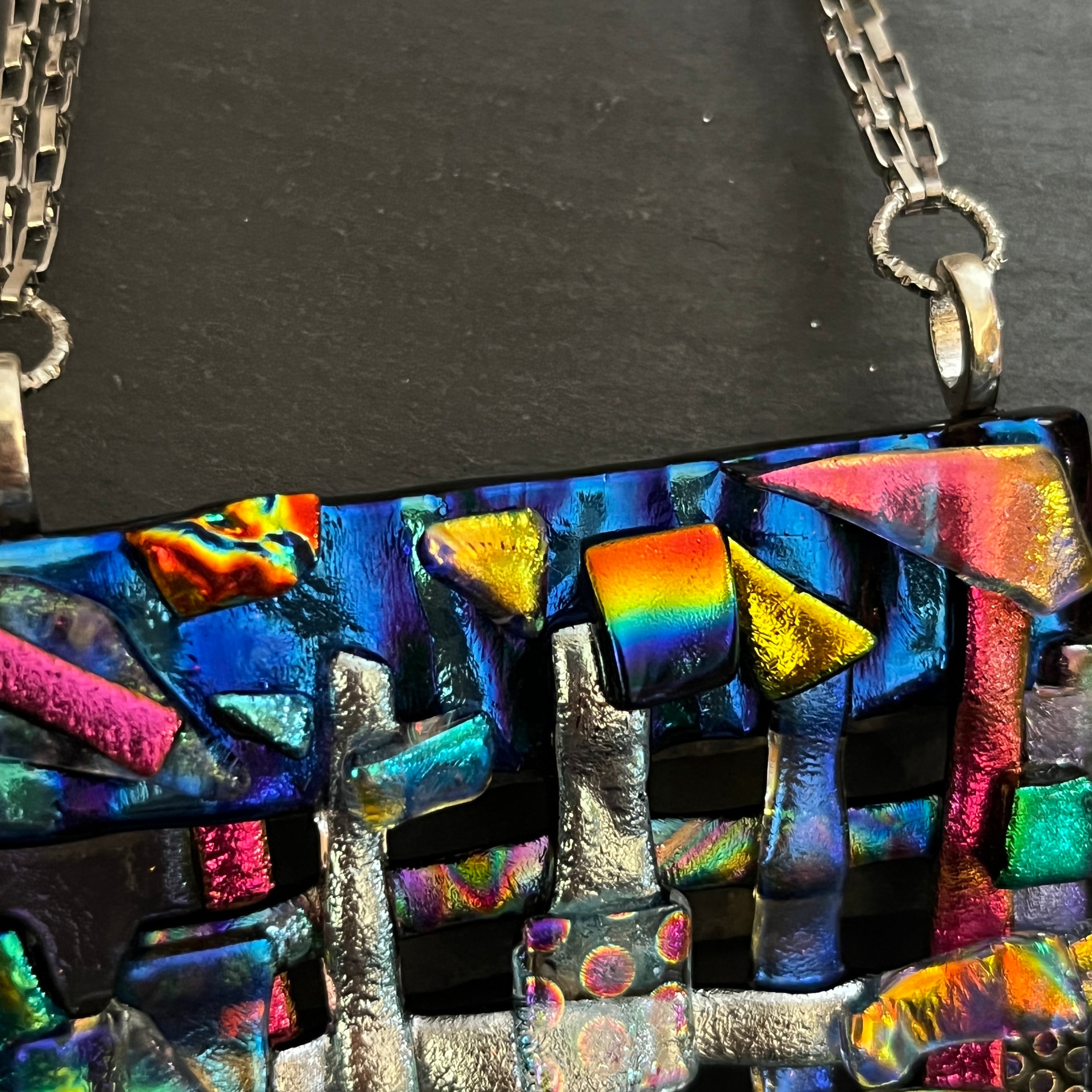 NASAが開発、ガラスの片面に金属(金・銀・銅・チタン)を真空蒸着したもの。ベースになるガラスの色と蒸着する金属の組み合わせによって、虹色や玉虫色など、さまざまな色彩に輝くガラスです。