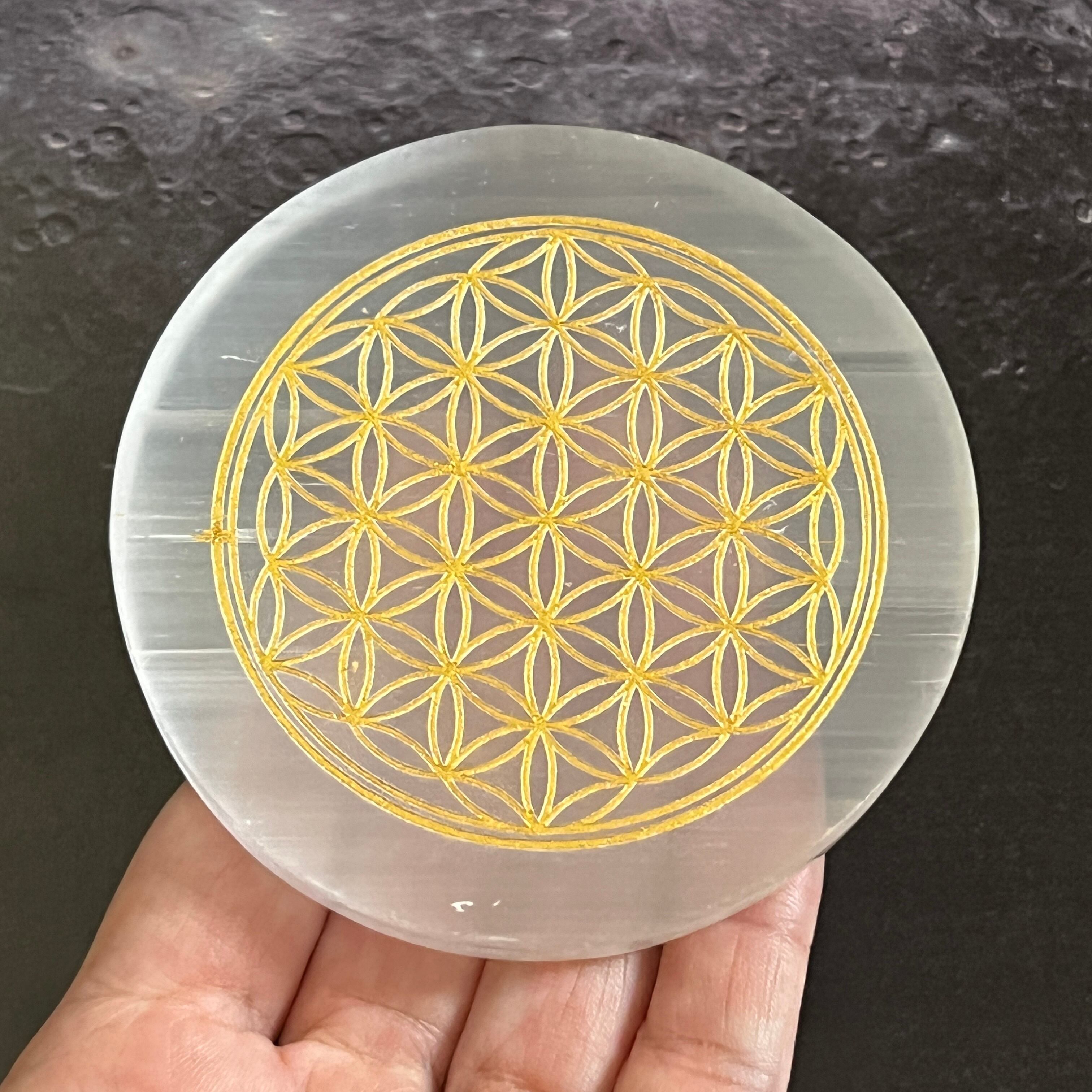 セレナイトに刻印されたフラワーオブライフが美しく輝く、直径約8cmのプレートです。