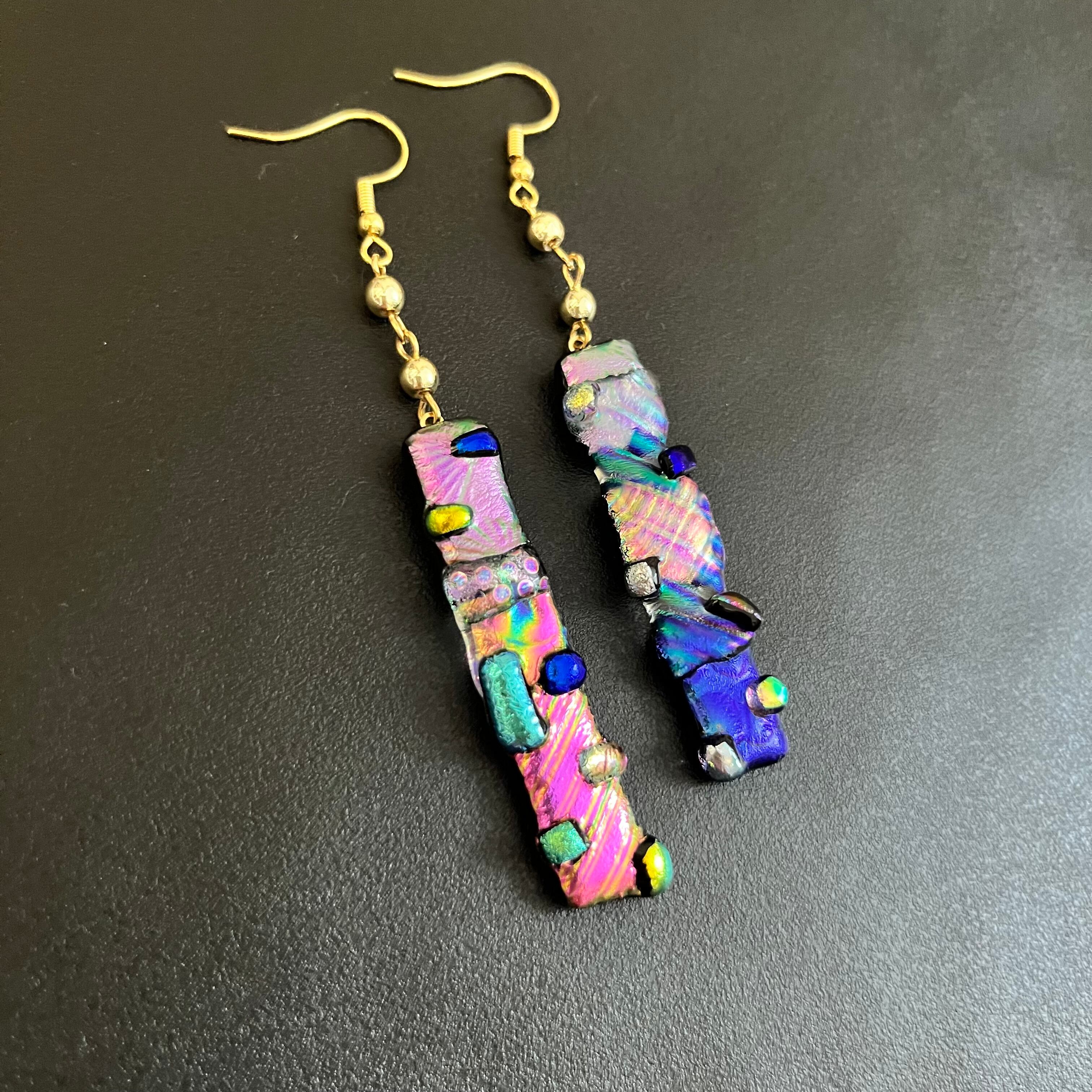 NASAが開発、ガラスの片面に金属(金・銀・銅・チタン)を真空蒸着したもの。ベースになるガラスの色と蒸着する金属の組み合わせによって、虹色や玉虫色など、さまざまな色彩に輝くガラスです。