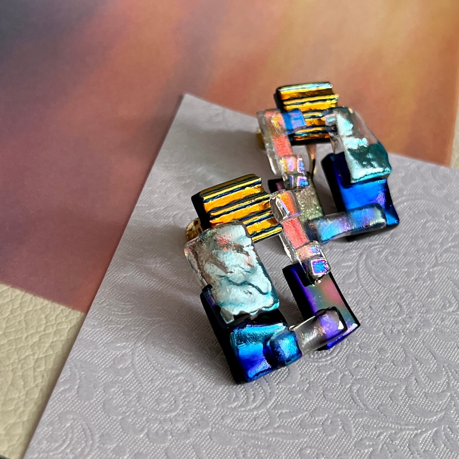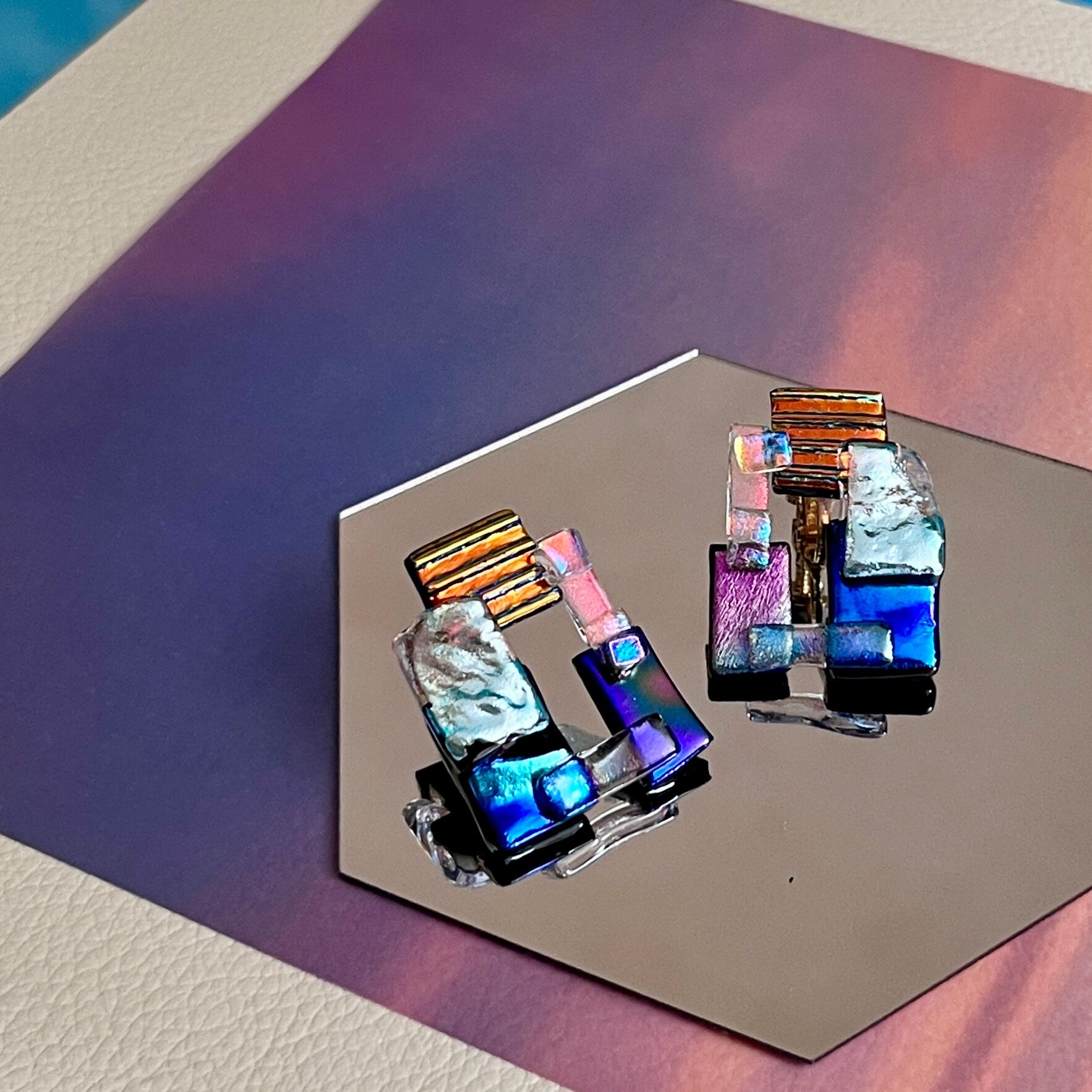 メタリックに輝くガラスを何枚も組み合わせた